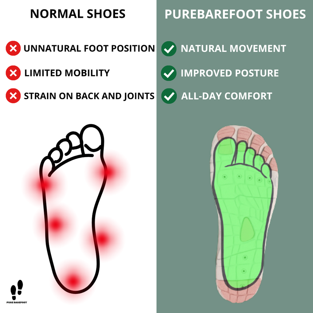 Barefoot shoes are designed to give you the feeling of walking naturally — just like being barefoot — while still protecting your feet. With a flexible sole and wide toe box, PureBarefoot lets your feet move the way nature intended. Once you try them, you’ll never want to go back to stiff, narrow shoes.
